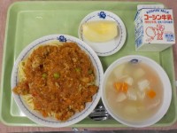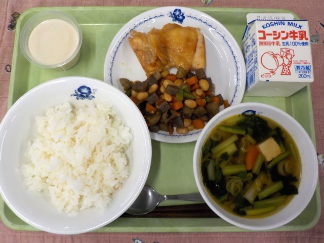 今日の給食は、「大豆」や「大豆製品」を多く使った献立です。目には見えにくい調味料も合わせると、5種類の大豆・大豆製品が入っています。「豆は苦手なんです」という児童もいますが、大豆はいろいろな形に姿を変えて、日常の食事になじんでいるということを知ってほしいと思います。