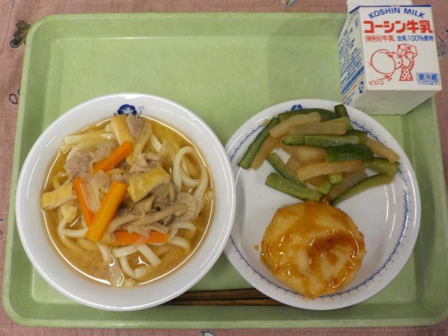 今日の主食は「みそうどん」です。急に気温が下がってきたので、温かいうどんがより美味しく感じられますね。また、「じゃが芋もち」は、蒸してつぶしたじゃが芋に片栗粉や調味料を混ぜて成型し、油でカリッと揚げて甘辛いタレをかけた料理です。滑らかさと粘り気を出すために、長芋も混ぜています。