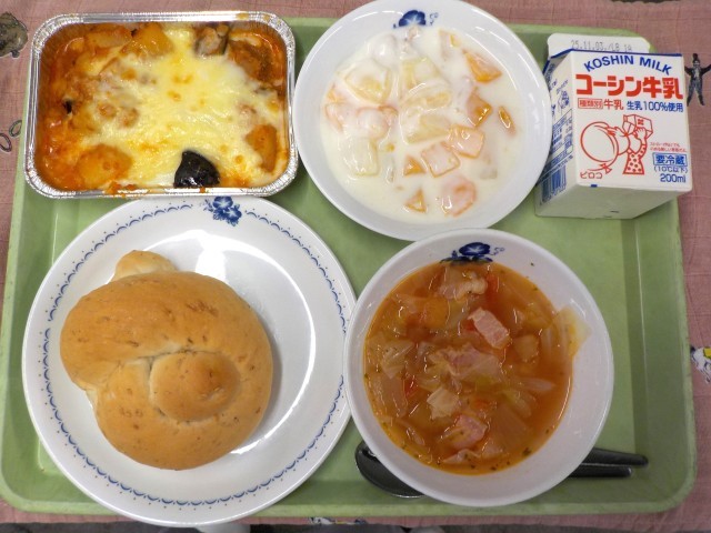 今日の給食はギリシャの料理です。「ムサカ」は、なすやじゃが芋にホワイトソースとミートソースを重ね、チーズをかけて焼き上げた、ギリシャの伝統的な料理です。また、豆が入ったスープも、ギリシャの定番の家庭料理です。