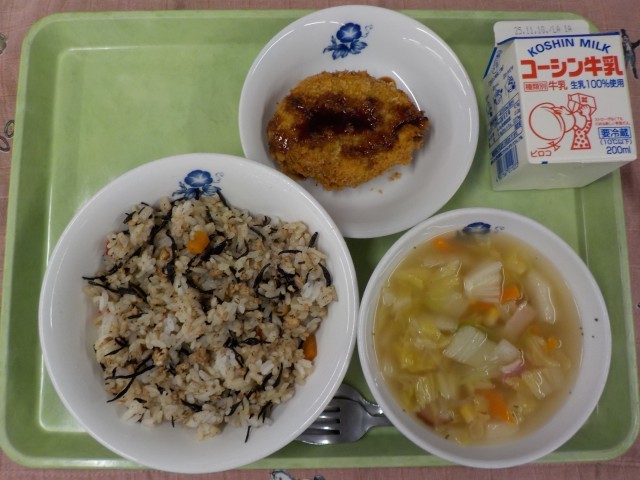 今日の給食はハロウィンメニューです。「ひじきピラフ」は、夜をイメージさせるハロウィンカラーの黒色のピラフです。バターの風味で、和風のひじきごはんとは違った味わいです。主菜は、かぼちゃを蒸して皮ごとつぶして作ったコロッケです。バターやスキムミルクを練りこんで、こちらも洋風に仕上げました。
