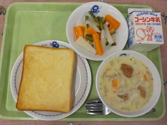 今日の主食は「キャラメルトースト」です。食パンにキャラメルソースを塗って、オーブンで焼きました。キャラメルソースは、グラニュー糖と水を煮詰めて少し焦がし、生クリームとバターを混ぜて作りました。そして、主菜は「ミートボールシチュー」です。ひき肉をこねて1つずつ丸めて作ったミートボールは、一度油で揚げてからシチューに入れました。