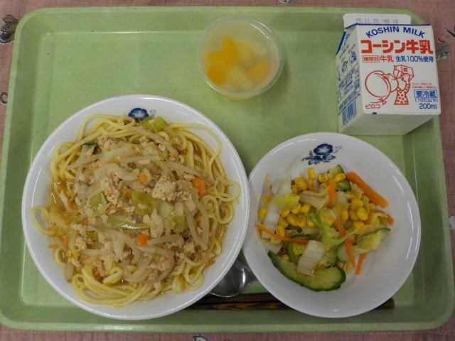 今日の主食は「たんたんめん」です。たんたんめんは、ひき肉が入ったピリッと辛い味付けの中華めんです。スープには練りごまや豆乳が入っているので、まろやかな味わいです。また、デザートの「フルーツゼリー」には、パイナップルとももの果肉が入っています。