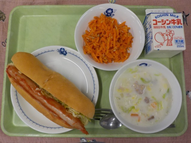 今日の副菜は「にんじんのラペ」です。細く切ったにんじんをドレッシングであえたフランスの定番料理です。ドレッシングには、すりごまや、みじん切りにした「らっきょう漬け」を入れました。栄養たっぷりのにんじんを、美味しくたくさん食べられる料理です。また、汁物には冬野菜を代表する白菜をたっぷり入れました。体が温まるクリーム仕立てのスープです。
