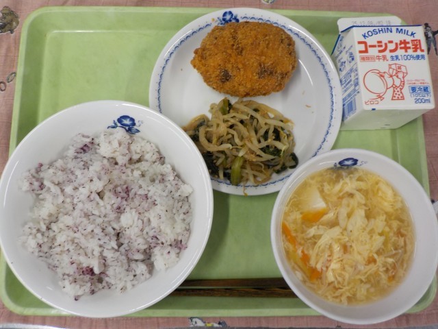 今日の主菜は「きんぴらコロッケ」です。ひき肉とごぼうなどの具材をしょうゆ味で炒めて混ぜた和風のコロッケです。味がしっかり付いているので、ソースはかけずに、ごぼうの香りを味わってほしいと思います。