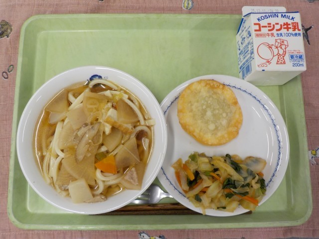 今日の主食は、とり肉と大根、にんじん、ごぼうなどの根菜がたっぷり入った「けんちんうどん」です。寒くなってきたので、温かいうどんが一段と美味しく感じられますね。また、デザートの「さつまいもパイ」は、さつまいもやバターなどを、ぎょうざの皮ではさんで揚げた料理です。今日は東京都内産の「紅はるか」を使いました。