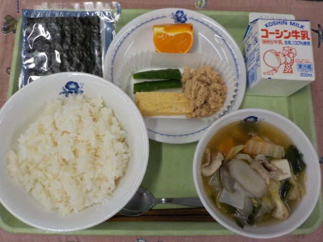 今日の主食は「手巻き寿司」です。手巻き海苔に自分で酢飯と具材をのせて、手で巻いて食べます。具材は、卵焼き、ツナ、きゅうりの3種類です。具の組み合わせや巻き方は自由なので、自分好みの手巻き寿司作りを楽しみました。デザートの「みはや」は、濃いオレンジ色で見た目が美しく、酸味が少なく甘みが強い柑橘です。