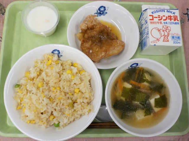 今日の給食は中国の料理です。主食の「チャーハン」は、日本の家庭でもよく作られている料理です。卵と長ねぎを、ごはんと一緒に油で炒め合わせました。主菜の「ユーリンチー」は、唐揚げにした鶏もも肉に、長ねぎが入った甘酸っぱいたれをかけた料理です。「杏仁ゼリー」は、牛乳と黄桃が入った優しい味わいのデザートです。