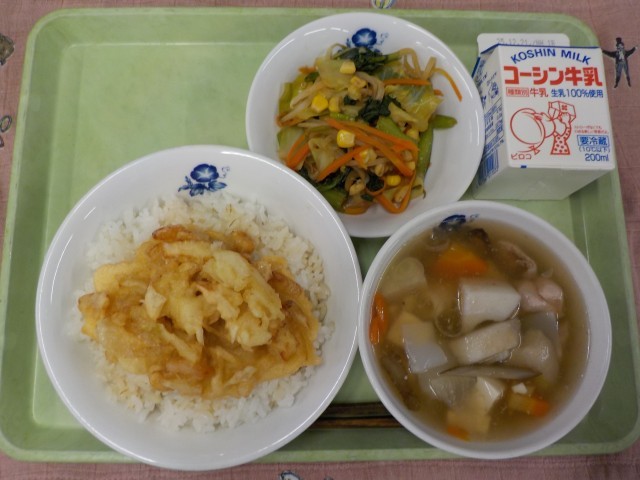 今日の主菜の「かき揚げ」は、魚介や野菜などを、小麦粉と卵の衣でまとめて油で揚げた天ぷらです。かき揚げはいろいろな食材で作ることが できますが、今日の具材は、えび、いか、大豆、たまねぎです。サクッと軽い食感にするために、衣にコーンスターチを少し加えました。かき揚げはごはんにのせて、特製のたれをかけていただきました。