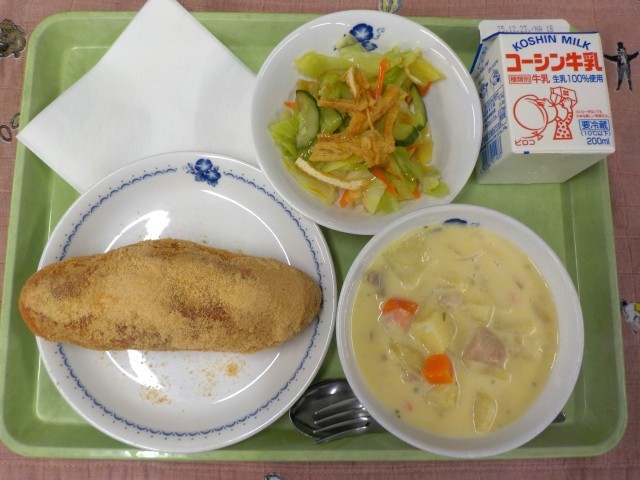 今日の主食は、上野小学校の給食の大人気メニュー「きなこ揚げパン」です。今日のコッペパンは、米粉を使って作ったパンです。いつもの小麦粉のパンと比べると、モチモチした食感で、パン自体に少し甘みがあるのが特徴です。