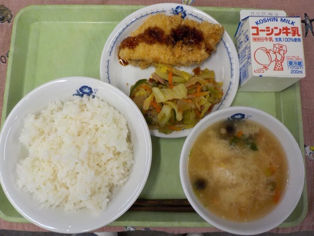 今日の主菜は、「ホキ」という白身魚に衣を付けて油で揚げた「魚フライ」です。揚げ立てのフライは、パン粉の衣が香ばしくカリカリの食感で、魚が苦手な人でも食べやすい料理です。副菜の「野菜炒め」は、オイスターソースを入れて、ごはんに合う味に仕上げました。「とりつくねの豆乳汁」は、とりひき肉をこねて作ったつくねを入れた、豆乳仕立てのまろやかな汁です。