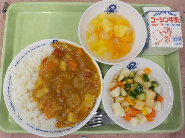 今日の主食・主菜は、エビやイカが入った「シーフードカレーライス」です。シーフードは煮過ぎると固くなってしまうので、バターで炒めて最後にカレーに加えました。