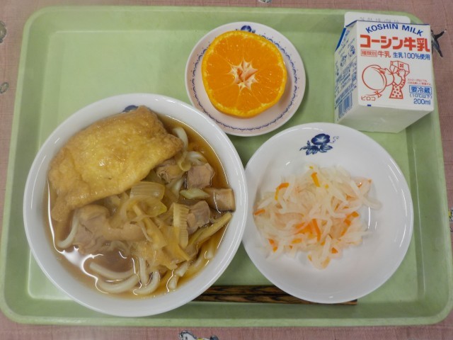 1月11日(日)は「鏡開き」です。今日の給食の主食は、油揚げにおもちを詰めて甘辛く煮た「もち入りきつね」をのせた温かいうどんです。関東地方では、おもちといえば四角い形の「切りもち」が主流ですが、鏡開きのおもちは包丁で切るのは縁起が良くないとされるため、今日は「丸もち」を使いました。