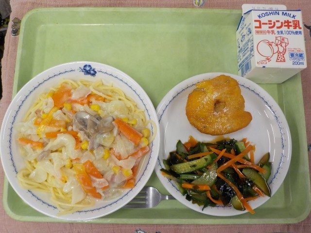 今日の主食は「コーンクリームパスタ」です。粒コーンとすりつぶしたコーンがたっぷり入ったクリームソースを、スパゲッティーにからめて食べます。デザートは「かぼちゃドーナツ」です。やわらかく蒸したかぼちゃを皮ごとつぶして、小麦粉や卵と混ぜてドーナツの生地を作りました。1つ1つ手作りなので、形はいろいろですが、調理員さんたちの心がこもっています。モチモチした食感と優しい甘さのドーナツです。