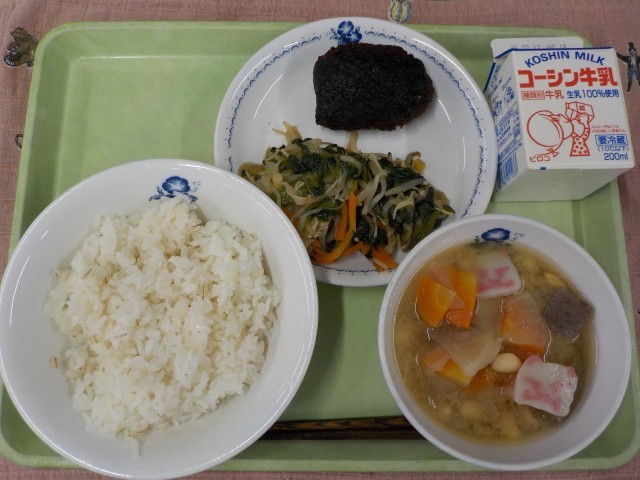 2月3日の「節分」の行事食です。主菜の「いわしのさんが揚げ」は、いわしのミンチにひき肉や豆腐、みそなどを混ぜて丸め、のりではさんで揚げた料理です。節分にいわしを飾ったり食べたりするのは、いわしのにおいで邪気をはらう意味があるといわれています。また、「鬼除け汁」には、大豆や鬼の形のかまぼこが入っています。