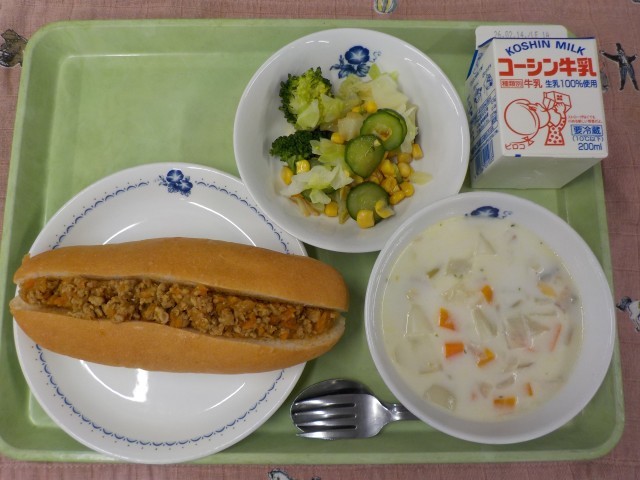 今日の主食は「カレーミートドッグ」です。コッぺパンに切れ込みを入れて、カレー味のミートソースをはさみました。また、主菜の「クラムチャウダー」はアメリカ東海岸発祥の料理で、二枚貝が入った具沢山で濃厚なスープです。サラダは、ビタミンや鉄分などの栄養が豊富なブロッコリーが入ったサラダです。