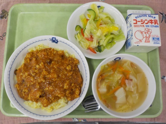 今日の主食・主菜は「ドライカレーライス」です。ドライカレーはその名の通り、水分をあまり入れずに作るカレーで、黄色いターメリックライスにかけて食べます。また、サラダは赤や黄色のパプリカが入った「カラフルサラダ」です。パプリカはピーマンの仲間ですが、苦みが少なく、甘くて食べやすい野菜です。