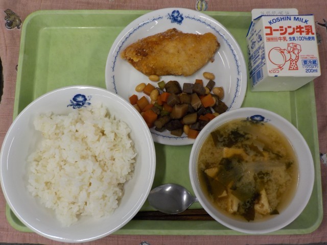 今日の給食は伝統的な和食献立です。ごはん、汁物、魚料理、野菜料理を組み合わせた食事は、栄養バランスが良く健康的だと言われています。副菜の「五目豆」は、ごぼう、にんじん、こんにゃく、しいたけ、さやいんげんをコロコロに切って、大豆と一緒に煮た料理です。今日は、食べやすいようにスプーンも付けました。