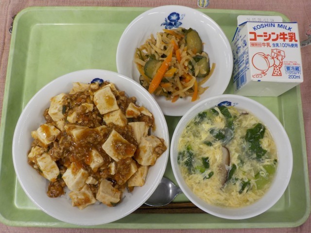 今日の主食は「マーボー豆腐丼」です。辛さは控えめですが、豆板醤や甜麺醤、ニラや長ねぎの風味が効いた本格的な味わいです。 副菜の「切干大根のナムル」は、切干大根のシャキシャキした食感を生かし、にんにくを入れてコクのある味に仕上げました。