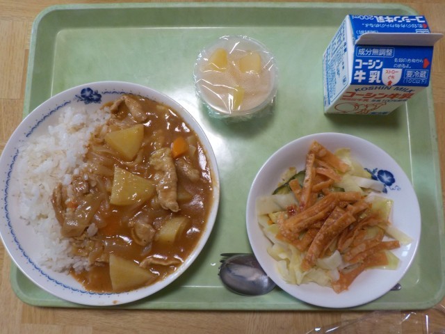 本日より1年生の通常給食がはじまりました。上野小学校のカレーライスはどの学年にも人気のメニューです。今日は、1年生が初めて食べるので、辛さを2段階に分けて作りました。どの学年のみなさんももりもり食べていましたよ。