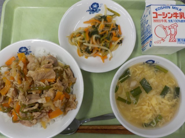 今日の主食の焼肉丼は、しょうがやにんにくを使い、ごはんが進む味付けにしました。そのおかげか、どのクラスもあっという間になくなっていました。また、にらたまスープの”にら”は今が旬の野菜です。