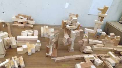 のこぎりで木材を切り、ボンドでくっつけて作品を作りました。木材をしっかりおさえて、力強くのこぎりをひいていました。
