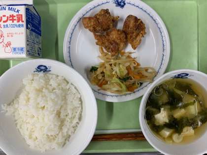 大崎市からの新米ご飯 鶏の唐揚げ 五色和え 味噌汁 牛乳