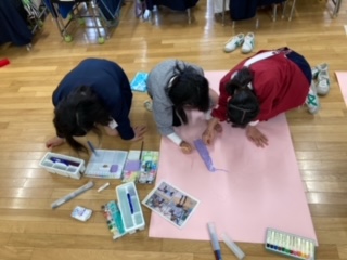 毎年、清島幼稚園さんとの交流で、5年生が年長さん園児の等身大の絵を描いて、幼稚園の修了式の前に渡しています。