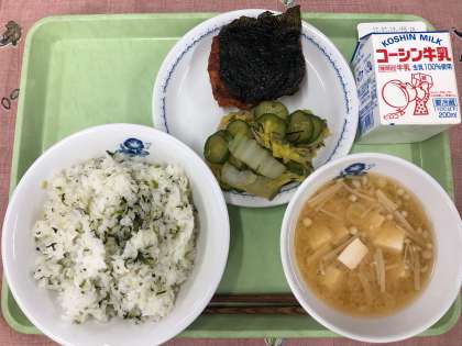 今日の主菜の「のりあげくん」は、れんこん、にんじん、じゃがいもなどを混ぜた鶏ひき肉に、海苔をつけて揚げた料理です。れんこんは半分はすりおろして、残りの半分は粗く刻んで入れることで、ふんわした食感とシャキシャキとした歯応えを出しました。海苔の風味がよく、冷めてもおいしいおかずです。