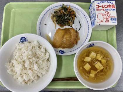 副菜の「磯香あえ」は、ひじきと刻み海苔を混ぜた野菜のあえものです。磯の香りが良く、栄養価も高い料理です。
