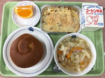 今日から1年生の給食が始まりました。配膳の練習をするため、今日は1年生はスープが付かない簡易給食です。ほんのり甘い「黒砂糖パン」と、焼きたての「マカロニグラタン」、甘くてジューシーな「清見オレンジ」、そして200mlの牛乳もお盆にのせて、元気に「いただきます」をしました。