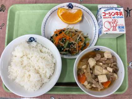今日の主菜は「肉豆腐」です。薄切り肉と豆腐、たまねぎなどを、すき焼き風の甘辛い味付けで煮込みました。