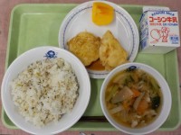いよいよ2年生以上の皆さんの給食が始まりました。今日は進級を祝う和食献立です。旬の新たけのこをたっぷり使った「たけのこごはん」は、竹のようにまっすぐ元気に育ってほしいという願いを込めて作りました。また、「すまし汁」には、桜の花の形のかまぼこが入っています。