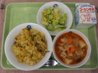 本日の献立は ツナカレーピラフ とり肉とじゃが芋のトマト煮 グリーンサラ...