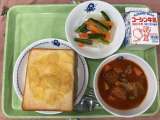 本日の献立は アップルトースト ミートボールのトマトシチュー 野菜のピクル...