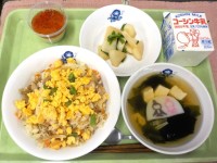 本日の献立は 五目ごはん 茶碗蒸し ごまあえ じゃが芋のみそ汁 牛乳 ...