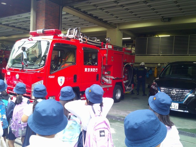 校外学習では、ポンプ車の中の装備を見せてもらったり、はしご車のはしごを伸ばした様子を見せてもらったりしました