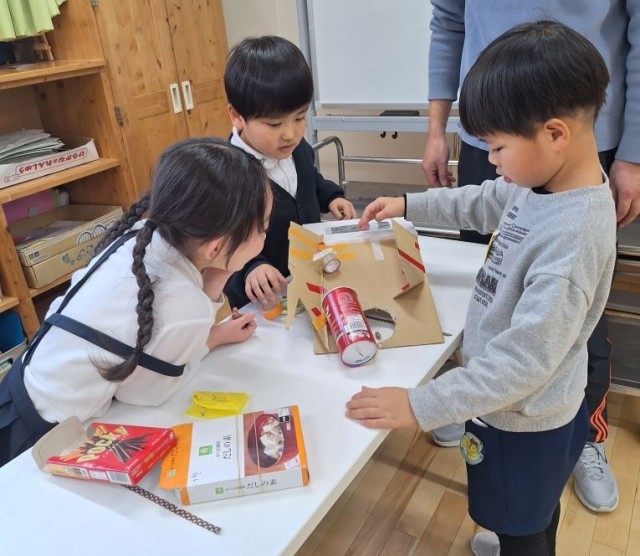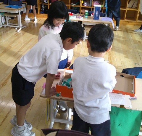 12月22日と23日に、1年生は、どんぐりランドを開催しました。22日は2年生、23日は竹町幼稚園のきく組さんを招待しました。「11月の校外学習で拾ったどんぐりをどうするか」というところから、「どんぐりおもちゃを作りたい」、「作ったどんぐりおもちゃで遊びたい」、「2年生ときく組さんを招待したい」と願いをもって学習を進めてきました。作り始めたときは、うまくいかず、何度も作り直したり、友達同士で助け合ったりと試行錯誤しながら作成していきました。どんぐりランド当日は、自分の作ったおもちゃを嬉しそうに紹介する1年生でした。2年生やきく組さんに楽しんでもらえるように、遊び方や説明の仕方を工夫する姿も見られました。2年生からは、「難易度を選べるどんぐりころがしゲームが楽しかった。」きく組さんからは、「もっと遊びたかった。」と嬉しい感想をたくさんもらえて大満足の1年生でした。