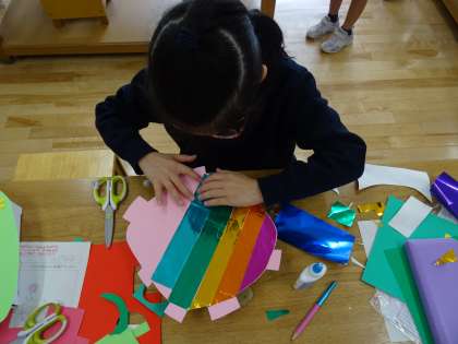 今日は、校長先生、副校長先生をはじめ、沢山の先生方が3年生の活動の様子を見に来てくださいました。いつもとは違う図工室の様子に、そわそわ&どきどき&わくわくハイテンションの3年生のみなさんでしたが、<ボディー>や<ネック>に色を塗ったり、飾りをつけたり、今回も沢山の工夫がみられました。