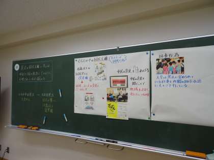今日は、日本国憲法の3原則の国民主権の考えについての学習を行いました。市や国が国民を中心に政治を進めていることを調べました。国民主権に基づいて行われている身近な取組には、選挙や情報公開制度などがあり、国民が主権者であることに気付いていました。