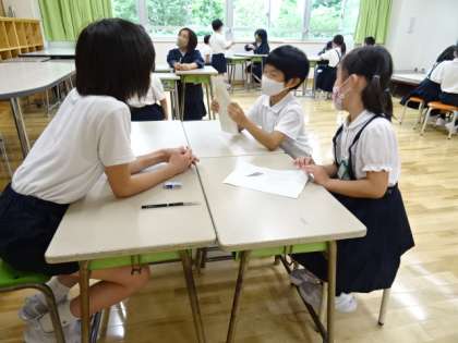 6年生も必死に考えて答えていましたが、難しい問題がたくさん!悩んでいる6年生の姿を見て、1年生がアドリブでヒントを出してくれました。最後は、6年生が1年生のワークシートにコメントを書いて渡しました。