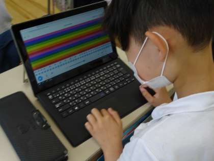 「絵や言葉をかいて、再生ボタンを押してみよう。どんな音楽ができるかな?」ということで、思い思いの絵や言葉を画面にかき、音楽をつくりました。偶然できる音の重なりやリズムなどを楽しんでいました。タブレットを持ち帰った際にはご家庭でも試してみてください。