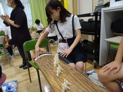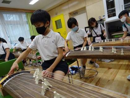 7月9日(金)、5年生は箏の演奏をしました。ゲストティーチャーをお招きして、箏について学習した後、「さくら さくら」を演奏しました。練習を重ねるうちに、コツをつかんだようで、2時間の授業の中で最後まで演奏することができました。2学期も箏の学習を続けていきます。