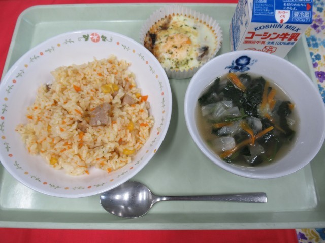 ・牛乳 ・キャロットピラフ ・卵のココット焼き ・ほうれん草のスープ