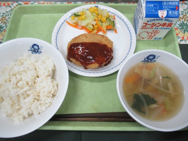 ・牛乳 ・麦ご飯 ・手作りコロッケ ・コーンサラダ ・野菜スープ