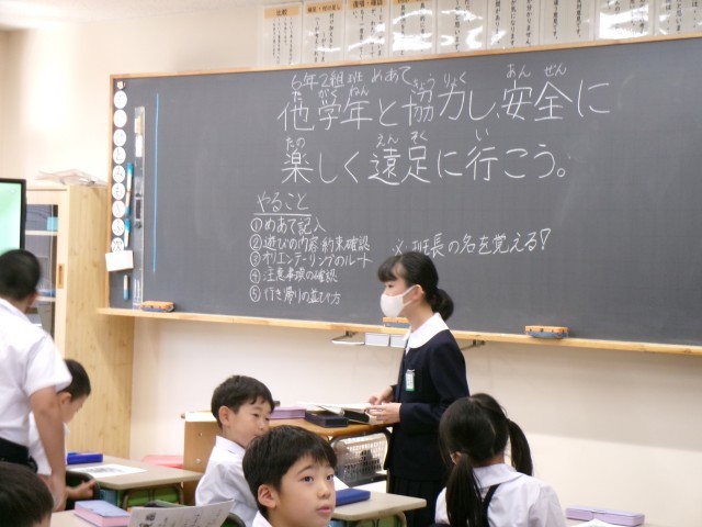 各スマイル班で当日のめあてや班遊びの内容、オリエンテーリングでまわる順番や持ち物の確認を、6年生の班長さんが丁寧に伝えてくれ、班のみんなも全校遠足に向けて気持ちを高めている様子でした。