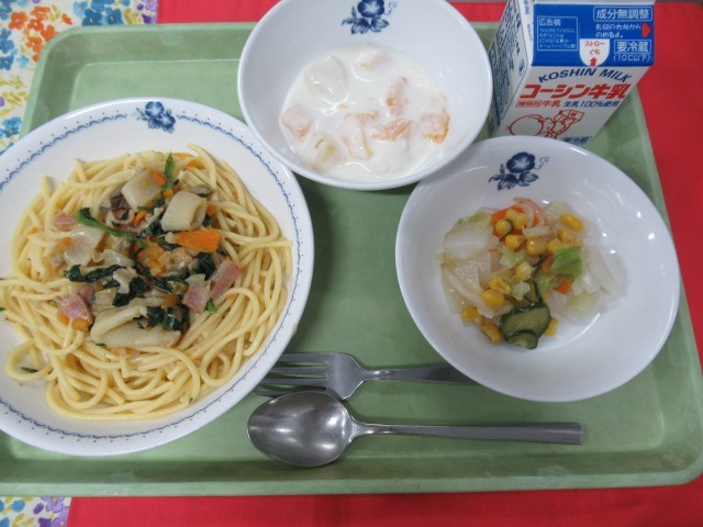 ・牛乳 ・ほうれん草とシーフードのスパゲッティ ・こんにゃく入りサラダ ・フルーツヨーグルト