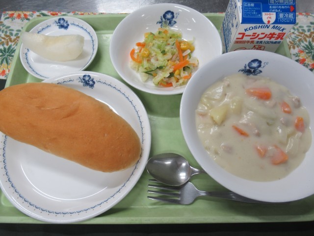 ・牛乳 ・コッペパン ・白いんげん豆のクリームシチュー ・コールスローサラダ ・梨