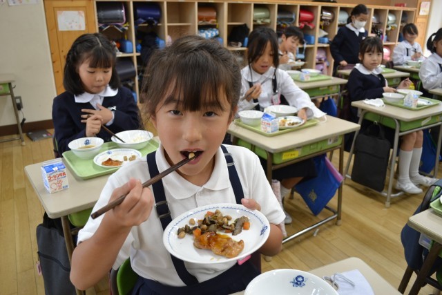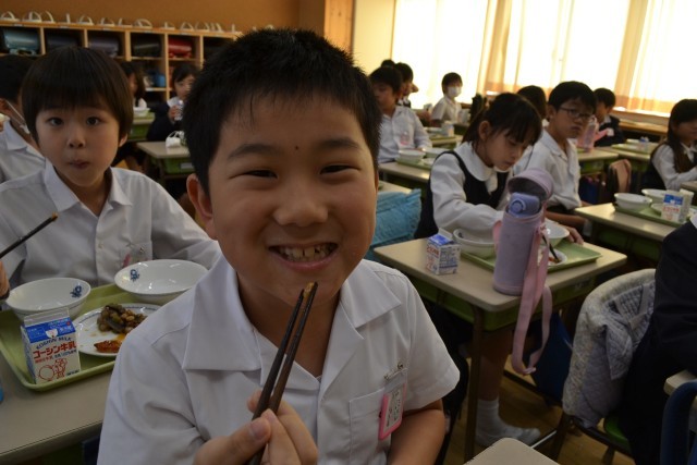 この日は2年生の教室におじゃましました。どのクラスでもお箸を上手に使っていただいている子供たちの姿がありました。先生の姿もありました。