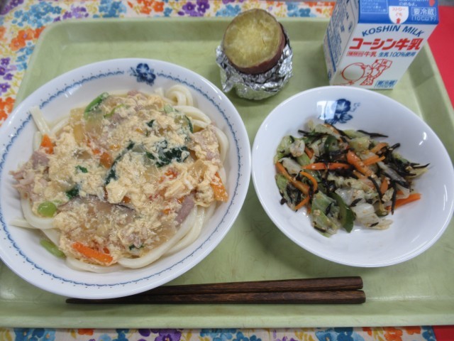・牛乳 ・かきたまうどん ・キャベツとひじきのサラダ ・焼きいも