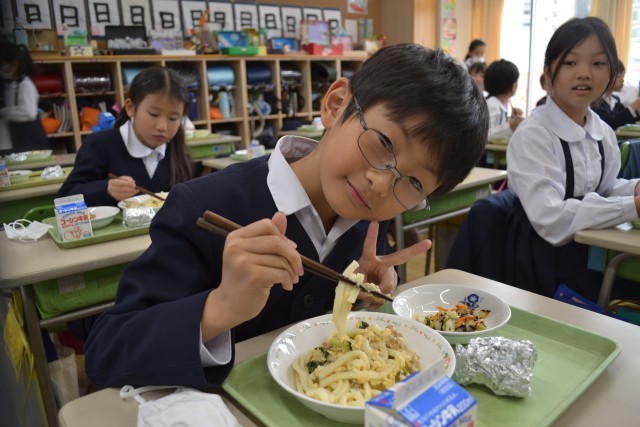 今日は3年生の教室におじゃまをしました。普段はおうどんを割り箸を使っていただくというお子さんも多かったようですが、この日は給食用のお箸を使ってすべらないように気を付けながら食べている様子が見られました。